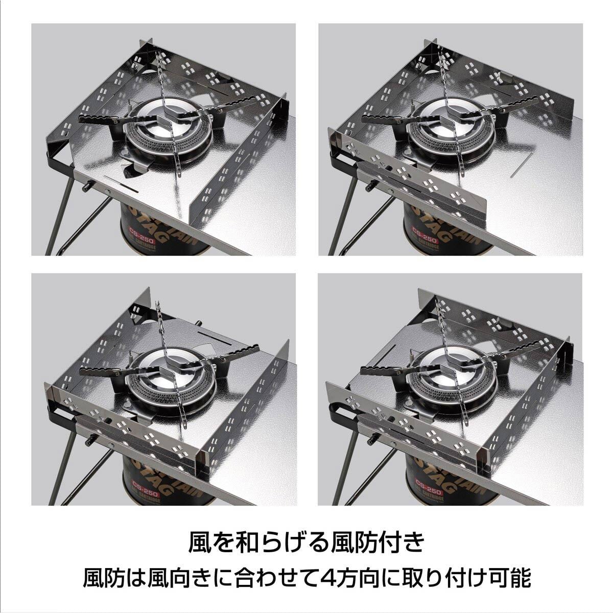 風を和らげる風防付き、風防は風向きに合わせて4方向に取り付けが可能です。